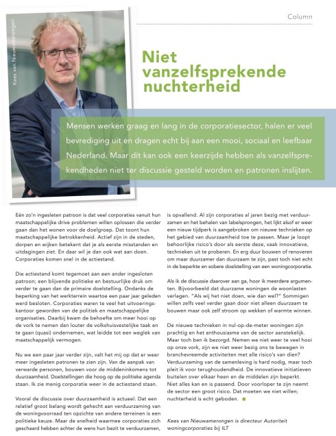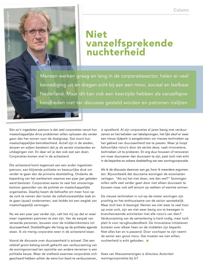 Goede, prikkelende column van Kees van Nieuwamerongen. Ben het eens met z’n pleidooi voor nuchterheid als het gaat om duurzaamheidsinvesteringen door corporaties. Waarom zouden corpo’s alleen het risico moeten dragen van nieuwe technieken? Ja, wij kunnen snel grote aantallen maken door het aantal woningen en de relatief eenvoudige financierbaarheid. Bij Domesta groeien we in kleinere stappen, en samen met huurders, toe naar een CO2 neutrale woningvoorraad.