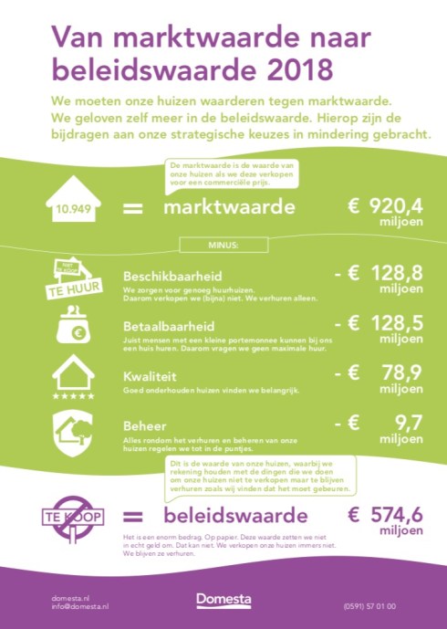 Hoe zou je een huis van een woningcorporatie moeten waarderen? Is dit tegen marktwaarde, tegen beleidswaarde of tegen bedrijfswaarde? Daar hebben wij wel ideeën over. En deze ideeën gaan we delen met de instanties die erover gaan. Maar hierboven zie je hoe we van de marktwaarde naar de beleidswaarde komen.