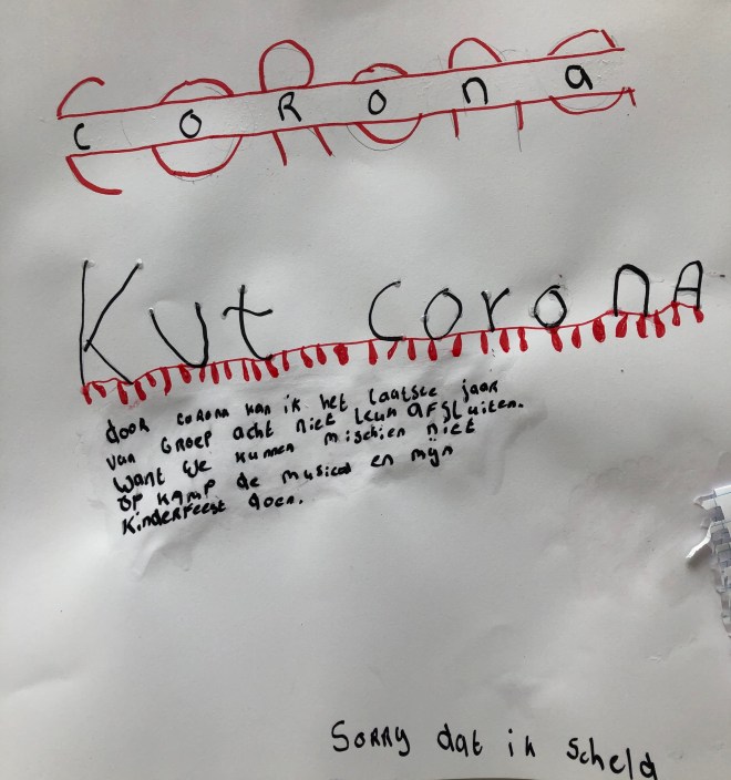 Alleen nu even niet. Het hield haar uit haar slaap. Ze kon er overdag geen woorden aan geven blijkbaar. ‘Kut Corona’, staat er met grote letters op de poster. Gevolgd door: ‘Door Corona kan ik het laatste jaar van groep acht niet leuk afsluiten. Op kamp, de musical en mijn kinderfeest doen.’