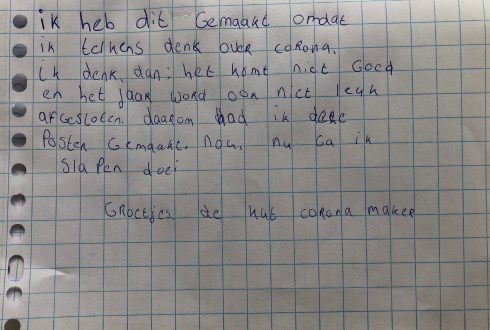 Er zit ook een briefje bij de poster. Met de reden waarom ze de poster maakte. ‘Ik heb dit gemaakt omdat ik telkens denk over Corona. Ik denk dan: Het komt niet goed en het jaar word niet leuk afgesloten. Daarom had ik deze poster gemaakt. Nou, nu ga ik slapen doei. Groetjes, de kut corona maker.’