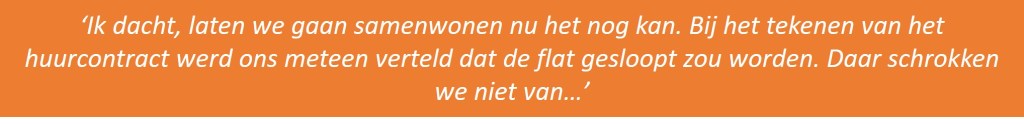 We slopen niet alleen hun huis, we grijpen in hun levens in. Voor de meeste bewoners is het niet de eerste keer dat hun levens op de kop komen te staan. Vergeleken met wat sommige van hen meemaakten is een verhuizing een peulenschilletje.
