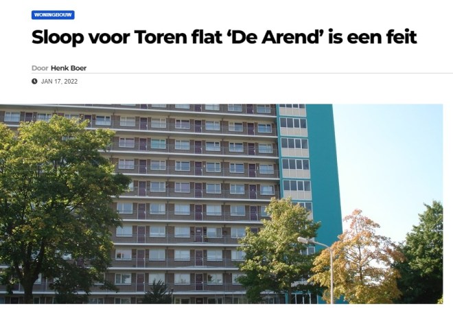 De Arend viert over een aantal jaar haar 60e verjaardag. Tijd om met pensioen te gaan. Dat kondigden we in 2009 al aan. Maar de bewoners vonden het toen nog te vroeg. Samen met de politiek werd druk uitgeoefend op Domesta om De Arend nog een tijdje te laten staan. Want mensen woonden er graag, het was betaalbaar en dichtbij de winkels en andere voorzieningen in Wolfsbos. Wel moesten er een aantal zaken worden vernieuwd. Domesta stemde hier mee in. De Arend kon 10 jaar later met pensioen.