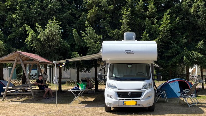 Op de vorige camping stonden we naast een jong stel. Een vrouw met een zoontje van een jaar of 10 en een dochter van 4 maanden oud. En een man van begin 30 schat ik. Zij, in een auto met een Duits kenteken, hij in z’n eigen sportieve Opel met Italië als thuisbasis. De baby deed haar dutjes in een soort hangmat die aan een dikke tak was gehangen. Ze sliepen met z’n vieren in dezelfde Decathlon-tent als m’n oudste dochter met haar vriendje deed. Met ook nog twee schoothondjes. Twee volwassenen, een tiener, een baby en twee hondjes in een tweepersoonstent. Waardig voor een plek in het Guinessboek of World Records of voor de Nobelprijs voor de vrede. Hun hele hebben en houden zat in een Ikea-kist van 60 bij 40 centimeter. We deelden de picknickbank die onze plek scheidde van hun plek. Geen stress, overal tijd voor. De dag nemen zoals deze kwam. Jaloersmakend mooi.