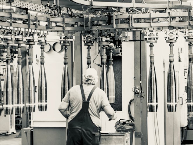 Een onschuldig plaatje zou je denken. De halffabrikaten aan de lopende band halen me uit de droom. Aan de lopende band hangen 11 hulzen van granaten. Voor de man met de kwast is het werk. Werk dat gedaan moet worden, om de huur, het leven en het pensioen te kunnen betalen. Ik denk niet dat de man ook maar en seconde nadenkt over de impact van z’n werk. Het is gewoon werk. Zijn werk. Als hij het niet doet, staan er wel tien anderen in de rij. Ze zouden z’n plek maar al te graag innemen.